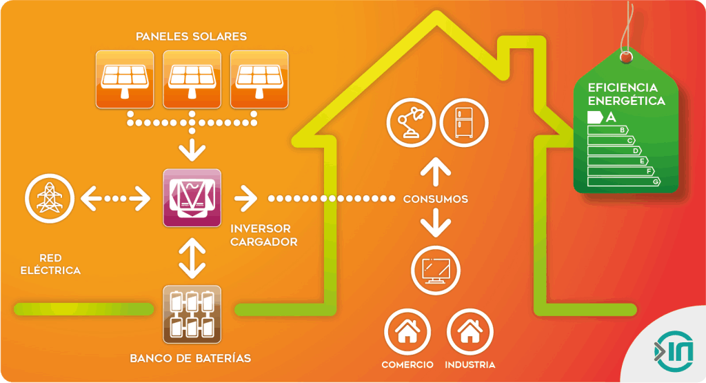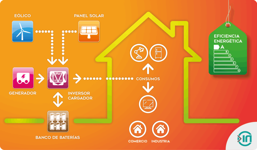 Permite utilizar los recursos naturales y almacenar energía mediante la combinación de reguladores de carga. Utilizando esa energía almacenada se convierte en corriente alterna de uso residencial, comercial o industrial.